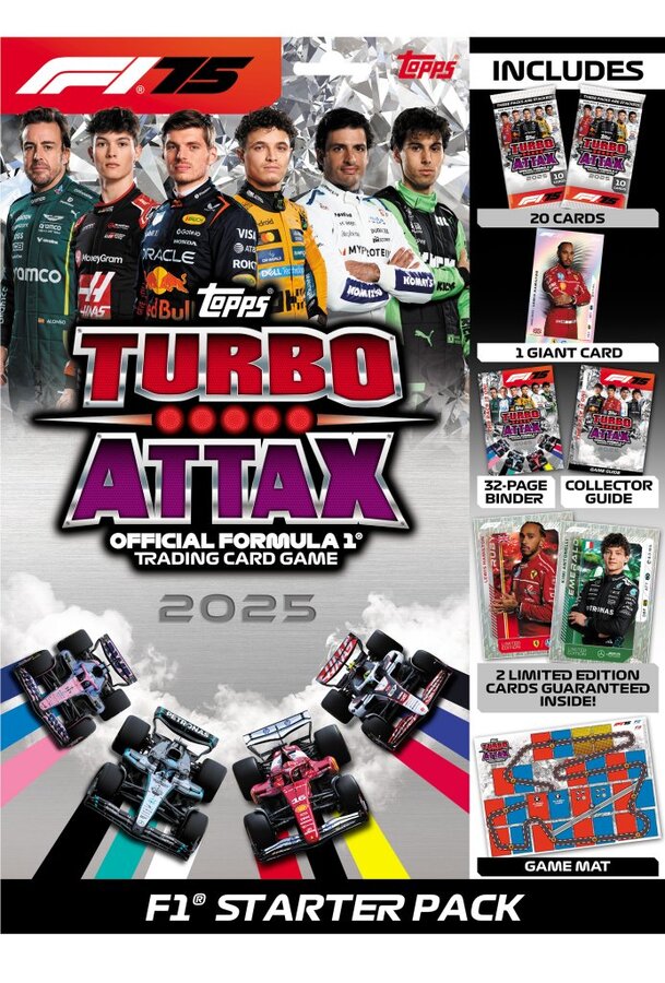 Each Starter Pack contains 20 cards, including 1 Antonelli Emerald Limited Edition and 1 Lewis Hamilton Ruby Limited Edition, plus 1 Giant Card (Lando Norris Supernova). And, there is a 32-page Binder, Collector Guide and a double-sided Game Mat.