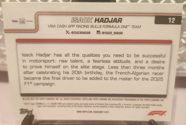 ![Isack Hadjar [Black White RayWave Refractor] #12 2025 Topps Chrome Formula 1](/images/572821/pid5897491/20260412_155739.jpg?tm=1775966951&kb=107)