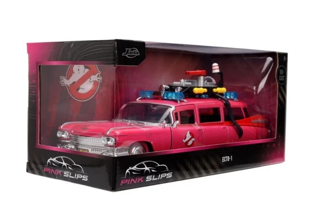 Jada Toys presents the all new Pink Slips - Ghostbusters Ecto-1 (Pink) 1:24 Scale Diecast Vehicle.
