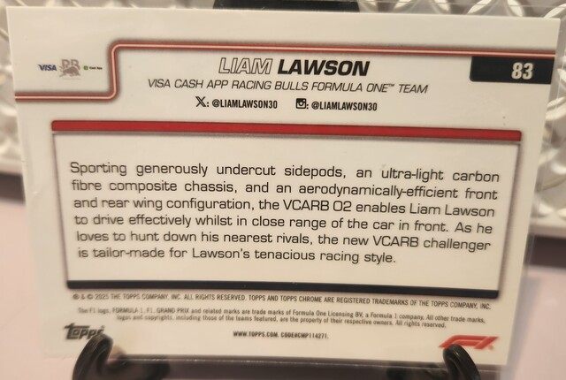 ![Liam Lawson 209/250 [Pink Raywave Refractor] #83 2025 Topps Chrome Formula 1](/images/572821/pid5886864/20260315_171011.jpg?tm=1773549067&kb=72)