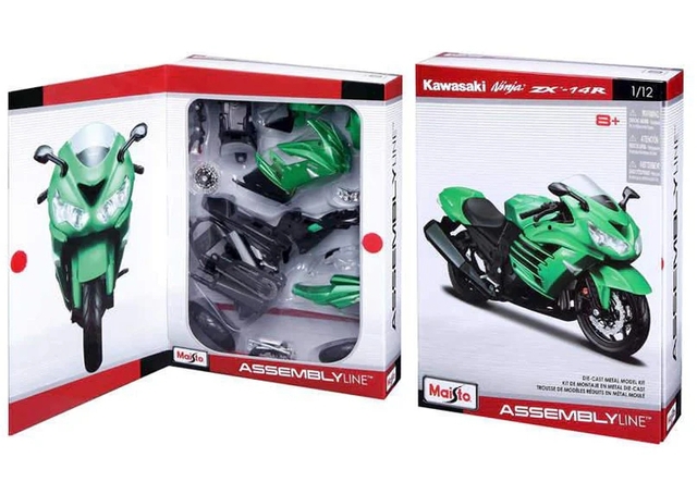 Complete model kit to build a diecast Kawasaki Ninja ZX-14R motorcycle in 1:12 scale. The kit contains close to 20 pieces all of which simply fit together, with everything you need to complete the model in the box. The finished model is highly detailed, with an authentic finish on the body and fine details found throughout.