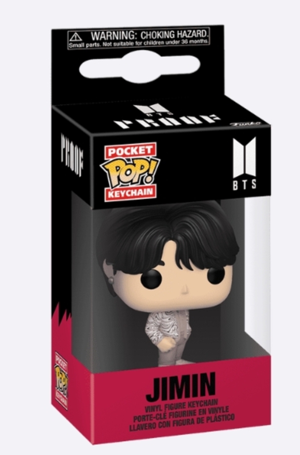 Score front row seats with Pop! Keychain Jimin! This member of K-pop sensation BTS is here to take the stage in your Pop! Rocks collection! Reunite him with the rest of the group in your music set as he rocks his outfit from hit album Proof. Vinyl keychain is approximately 4 in (10.2 cm) long.