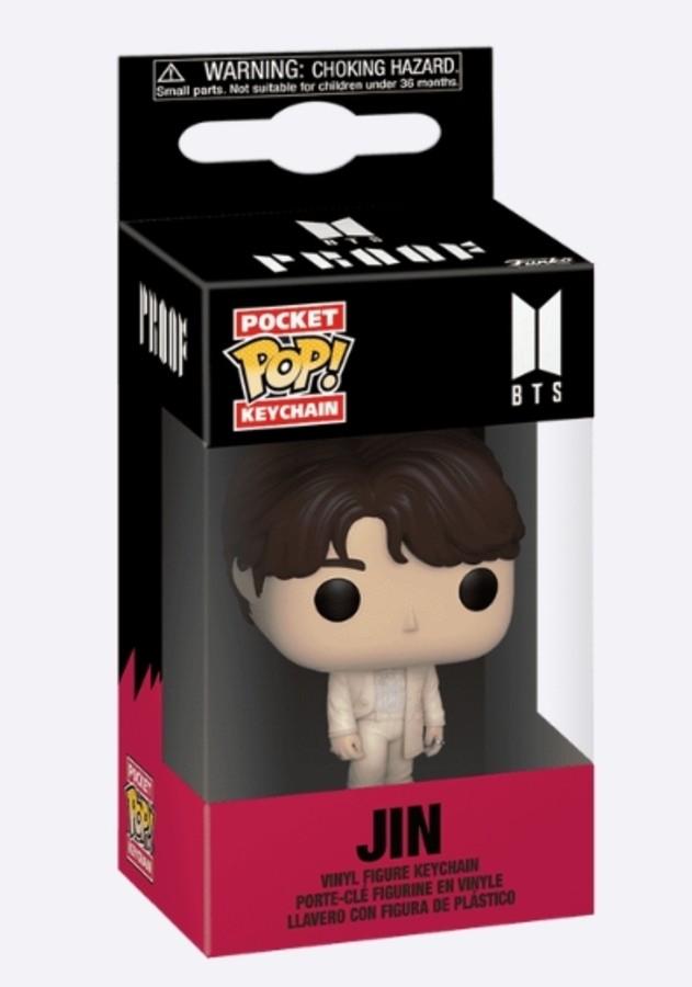 Score front row seats with Pop! Keychain Jin! This member of K-pop sensation BTS is here to take the stage in your Pop! Rocks collection! Reunite him with the rest of the group in your music set as he rocks his outfit from hit album Proof. Vinyl keychain is approximately 4 in (10.2 cm) long.
