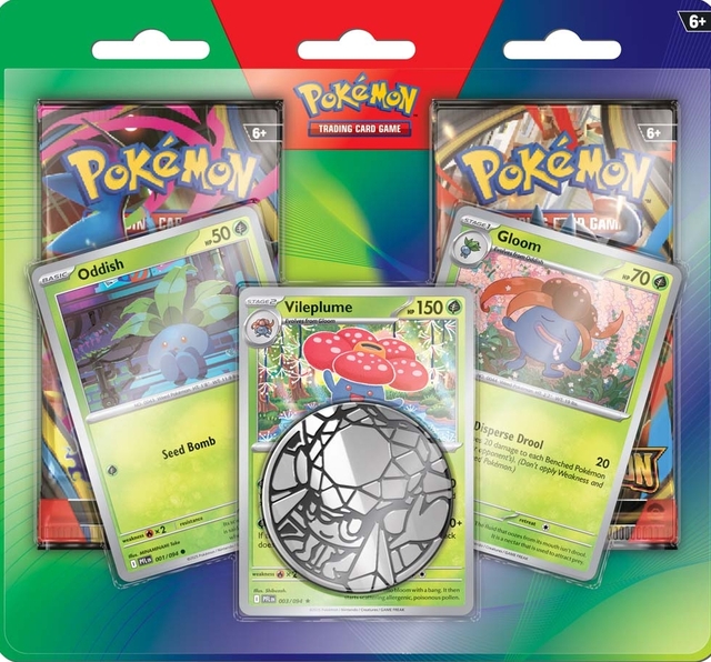 Expand your collection with foil Pokémon TCG cards featuring Oddish, Gloom , and Vileplume—plus a metallic coin and two Pokémon TCG booster packs! (Mega Evo & Phantasmal)