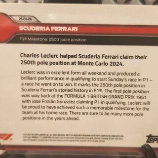 Topps Now 2024 Charles Leclerc Ferrari 250th Pole Position - Monaco GP