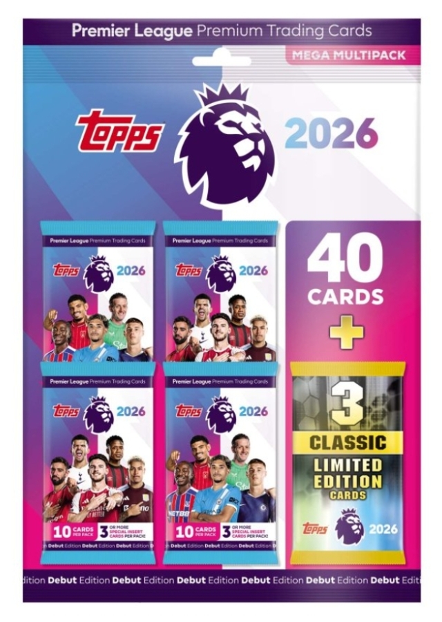 The Mega Multipack is the ultimate booster for your collection, containing 40 cards plus 3 random Classic Limited Edition cards. This innovative trading card collection brings fans closer than ever before to the heroes of the Premier League. Featuring an insane number of Autograph cards, rare sequentially numbered parallels, an incredible Rookie class with ultra-rare Diamond Rookie cards, special Chrome King Legends, mega-rare Premier Pull Limited Edition cards and the amazing Gold Lion cards, this collection is jam-packed with hits at every turn.