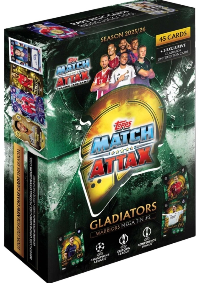 The Topps UCC Match Attax Mega Tin contains 45 Match Attax cards plus 3 exclusive Gladiators LE cards.