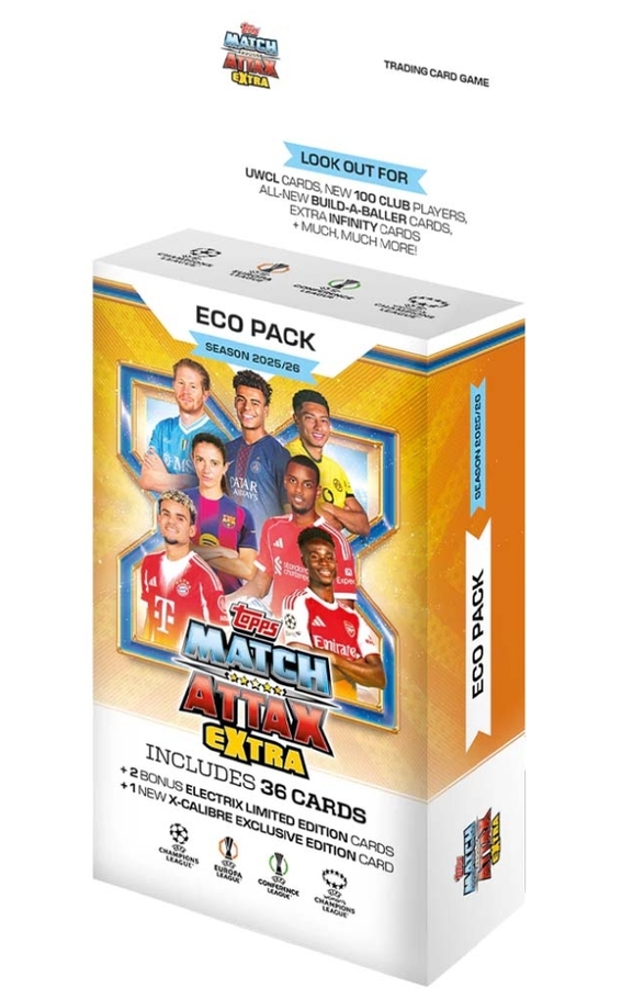 Topps UCC Match Attax Extra 2025/26 collection takes the season up a level with fresh, new inserts, a revised parallel program powering the Chrome X chase, and strong club representation across base and insert cards. ​ Every packet is built for hits – 4 inserts per pack and a bold promise: THESE PACKS ARE EXTRA-STACKED! – New Wing Man inserts, starring the most explosive wide players in Europe​ – 3 Hat Trick Heros, showcasing the most dangerous goal threats in European football​ – Brand new Build-A-Baller puzzle chase, finished with a Chrome Ultimate Baller​ – Super slick 3D X-Len designs, featuring your favourite players as never seen before​ – Paying tribute to football royalty through our majestic UCL Royal Elite cards​ – Genuine Autographs, Player-Worn Jersey Relics, and brand-new foil finishes Whether you’re building your dream XI, chasing the iconic Black Board inserts, or hunting for one of just 5 Pro View original autograph cards, this season delivers a Collector-first experience packed with energy, innovation and ‘exclusive rewards