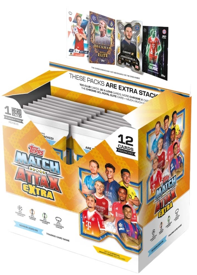 Topps UCC Match Attax Extra 2025/26 collection takes the season up a level with fresh, new inserts, a revised parallel program powering the Chrome X chase, and strong club representation across base and insert cards. ​ Every packet is built for hits – 4 inserts per pack and a bold promise: THESE PACKS ARE EXTRA-STACKED! – New Wing Man inserts, starring the most explosive wide players in Europe​ – 3 Hat Trick Heros, showcasing the most dangerous goal threats in European football​ – Brand new Build-A-Baller puzzle chase, finished with a Chrome Ultimate Baller​ – Super slick 3D X-Len designs, featuring your favourite players as never seen before​ – Paying tribute to football royalty through our majestic UCL Royal Elite cards​ – Genuine Autographs, Player-Worn Jersey Relics, and brand-new foil finishes Whether you’re building your dream XI, chasing the iconic Black Board inserts, or hunting for one of just 5 Pro View original autograph cards, this season delivers a Collector-first experience packed with energy, innovation and ‘exclusive rewards’.