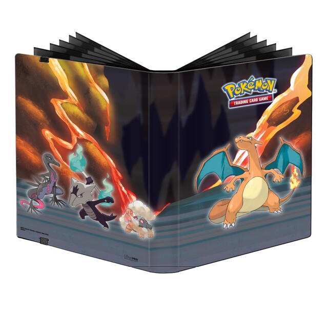 9-Pocket PRO-Binders for Pokémon feature a vibrant, full-art cover of Charizard, Salazzle, Torkoal, and Alolan Marowak, and includes an elastic strap closure. Side-loading pockets and low-friction material help keep cards in place. Safely stores up to 360 cards in archival-safe, acid-free, non-PVC pages.